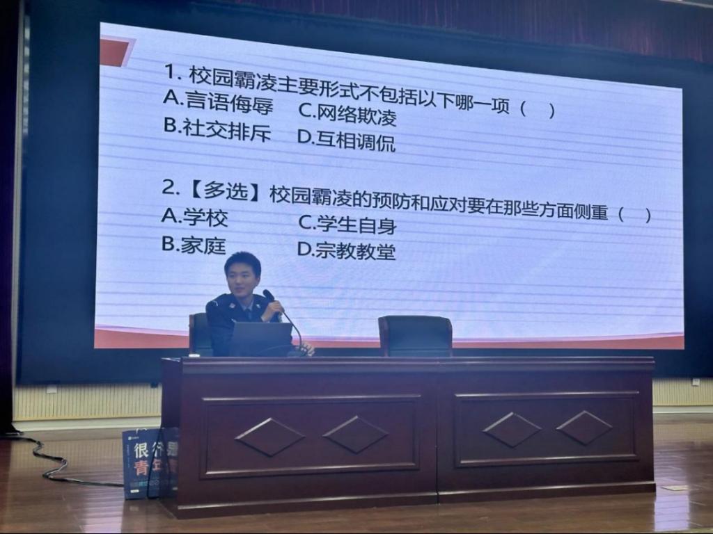 为进一步增强学生的法律意识和法治观念,加强法治安全教育,提高学生学法、守法的意识,营造文明、平安、和谐的校园育人环境。2024年11月26日,中专教学部邀请河南司法警官职业学院二级主任科员刘小苗讲师在报告厅开展法治教育讲座。中专教学部副书记张薇、教师张若兮、21戏曲中专班主任陈明、23器乐表演、曲艺表演中专班主任吴辉、24舞蹈表演中专班主任李鑫、24戏曲表演2班中专班主任艾娜、全体教官以及全体在校学生聆听讲座,讲座由中专教学部宋歌老师主持。